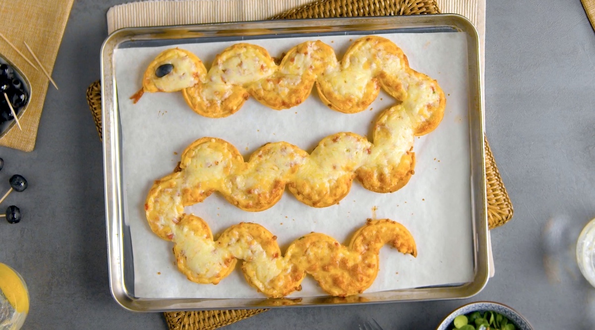 Corta las minipizzas por la mitad y colócalas escalonadas en la bandeja de horno para que formen un cuerpo de serpiente. Espolvorea las pizzas con mozzarella y ponle a la serpiente un ojo con una aceituna cortada, y una lengua con un trozo de salami. Hornea la pizza durante 20-30 minutos en el horno de convección a 180 °C (o con la circulación de aire activada).