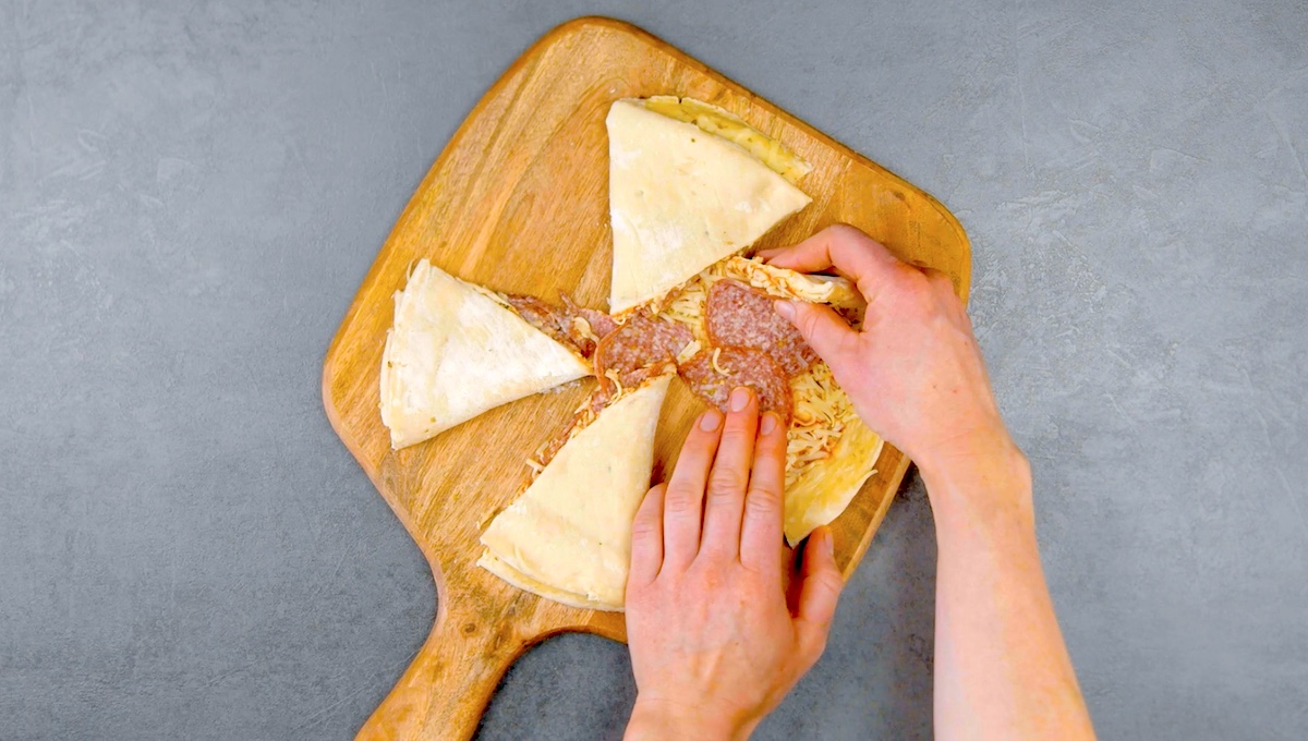 Corta la primera pizza cuatro veces casi hasta la mitad. A continuación, dobla dos trozos juntos para formar una especie de rehilete.