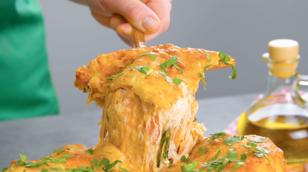 Dobla la pizza de manera que parezca un cuerno. Colócala en una fuente de horno y hornéala durante 20-30 minutos a 180 °C en el horno de convección (o con la circulación de aire activada). A continuación, rellena el cuerno de pizza con espagueti a la boloñesa y espolvoréalo con perejil.