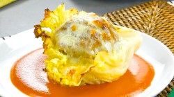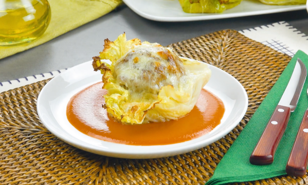 Nos encanta la col de Milán (col de Saboya). Esta verdura redonda y verde es deliciosa y saludable, perfecta para preparar recetas supercreativas. Hoy te vamos a enseñar a hacer albóndigas rellenas de queso en un molde para muffins. ¿Y cómo no?, le vamos a añadir una buena porción de queso y una suave crema de tomate.
