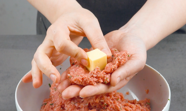 - Mezcla la carne molida con el perejil picado, el huevo, la cebolla picada y el pan rallado, y forma varias tortitas con las manos. Corta el queso en cubos y coloca uno en el centro de cada tortita de carne. Después cierra las tortitas y dales la forma de albóndigas.
