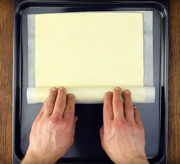- Precalienta tu horno a 190 ºC. Despliega la primera capa de masa de hojaldre sobre una bandeja de horno.