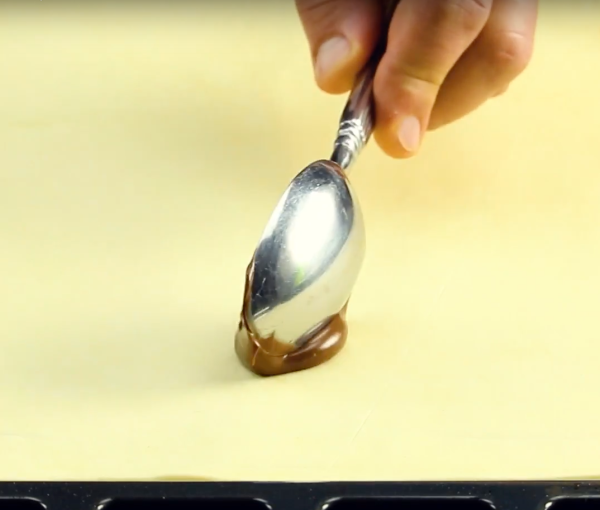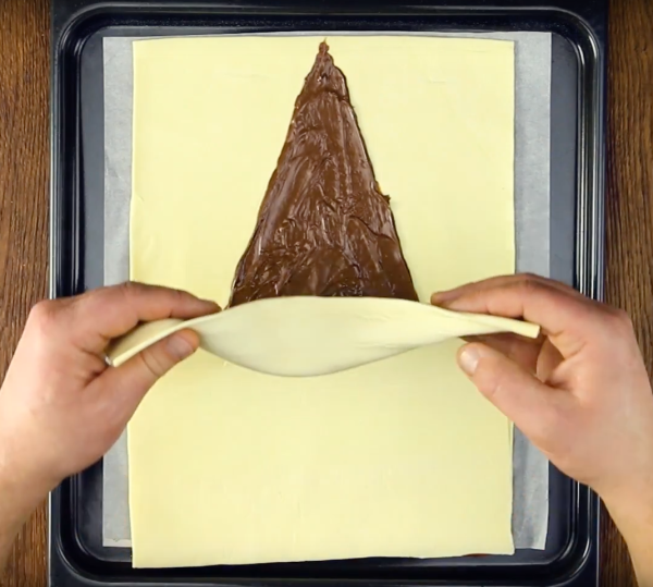 - Pon la Nutella en el centro de la masa y esparce con la parte de atrás de la cuchara hasta hacer la figura de un triángulo.