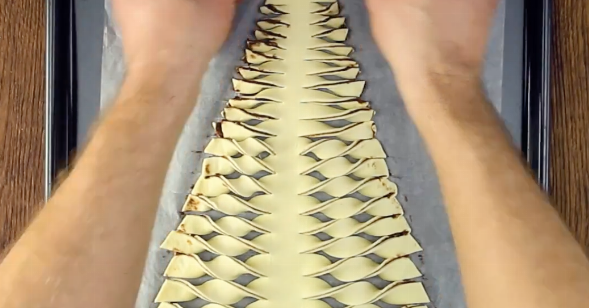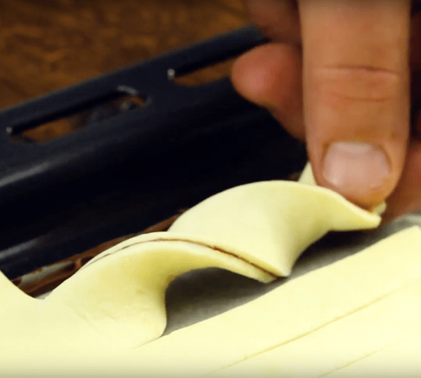 - Cubre todo con el segundo rollo de masa de hojaldre y corta el triángulo con un cuchillo de cocina.