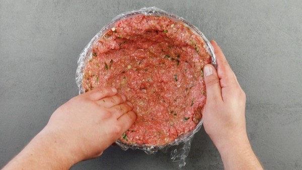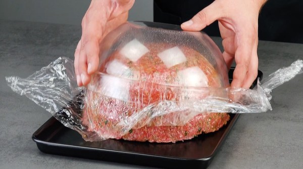 - Mezcla todos los ingredientes para la carne molida. Cubre un bol con film de plástico transparente y distribuye por él unos 2/3 de la mezcla de carne molida.