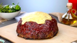 - Voltea tu bomba de carne sobre una bandeja de horno cubierta de papel de hornear y retira con cuidado el bol y el film de plástico. Unta la superficie de la bomba con salsa barbacoa, cúbrela y hazla al grill durante 45 minutos a fuego medio. Luego espolvorea mozzarella por encima y vuelve a cocinarla cubierta otros 15 minutos hasta que el queso se haya derretido.