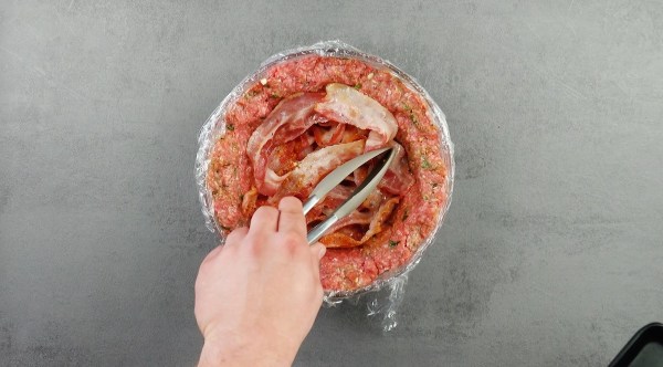 - Coloca 2/3 de las tiras de tocino sobre la carne. Retira el tronco de los pimientos y colócalos sobre las tiras de tocino. Coloca dos quesos camembert, uno encima de otro, sobre los pimientos. Distribuye el resto de tiras de tocino sobre los camembert. Cubre tu bomba de carne con el resto de carne molida.