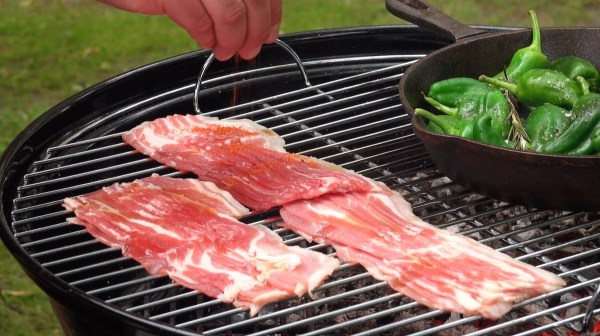 - Fríe los pimientos con el romero en aceite caliente y salpiméntalos. Fríe también el tocino por ambos lados bien y mientras lo haces, condiméntalo con jarabe de arce y especias barbacoa.