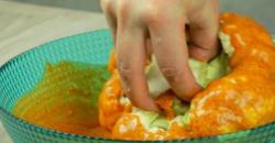 - Remoja la cabeza de coliflor en la mezcla y muévela en círculos hasta que esté completamente cubierta. También puedes usar un pincel de cocina.