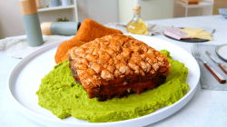 ¿Hasta ahora no te has atrevido a probar la panza de cerdo? Esto está a punto de cambiar con nuestro cordon bleu de panza de cerdo relleno de jamón, queso y ciruelas, con cáscara crujiente, croquetas gigantes y puré cremoso de guisantes. Una espectacular idea para una maravillosa cena en familia.