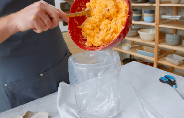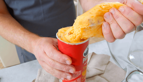 - Introduce la mezcla de papa con ayuda de la manga pastelera en un bote vacío de papas fritas y congela este durante 2 horas.
