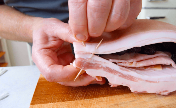 - Recorta una especie de bolsillo en el interior de la panza de cerdo. Coloca 1 rodaja de jamón sobre una de queso y cierra el jamón sobre el queso haciendo un sándwich. Haz esto 10 veces. Introduce los 10 sándwiches de jamón y queso dentro del bolsillo de la panza de cerdo. Añade también las ciruelas pasas al interior de la panza.