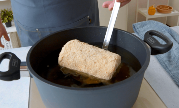 - Retira la base del bote de papas con un abrelatas y saca la masa de papa congelada del bote con ayuda de una botella. Corta el rollo por la mitad y empanízalo en harina, clara de huevo y pan molido. Repite los pasos con la otra mitad del rollo. Fríe los rollos en aceite a aproximadamente 160 °C de 12 a 15 minutos.