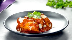 - Antes de servir, adorna el plato con los copos de almendra tostada y hojas de cilantro.
