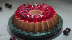 Flan de chocolate con cobertura afrutada de gelatina y cerezas frescas