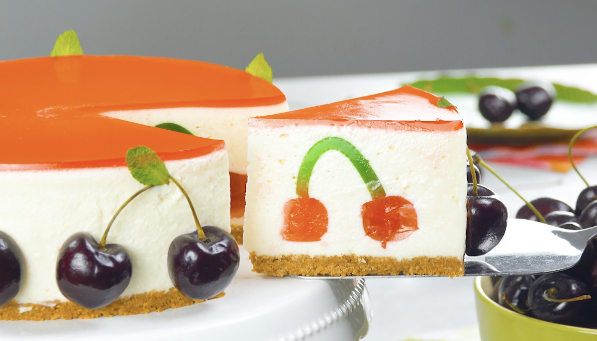 En los años 90 el «KiBa» era una bebida muy popular en Alemania. Se trata de una mezcla de jugo de cereza y plátano muy rica, saludable y energética. Los dos jugos se complementan perfectamente, la dulzura del plátano y la acidez de las cerezas producen un sabor único. Así que es hora de rendir homenaje a esta bebida mediante un pastel KiBa. Gracias a las gelatinas de colores, le dimos a esta tarta un diseño absolutamente mágico, que descubrirás al cortar la primera rebanada. ¡Pero míralo tú mismo!