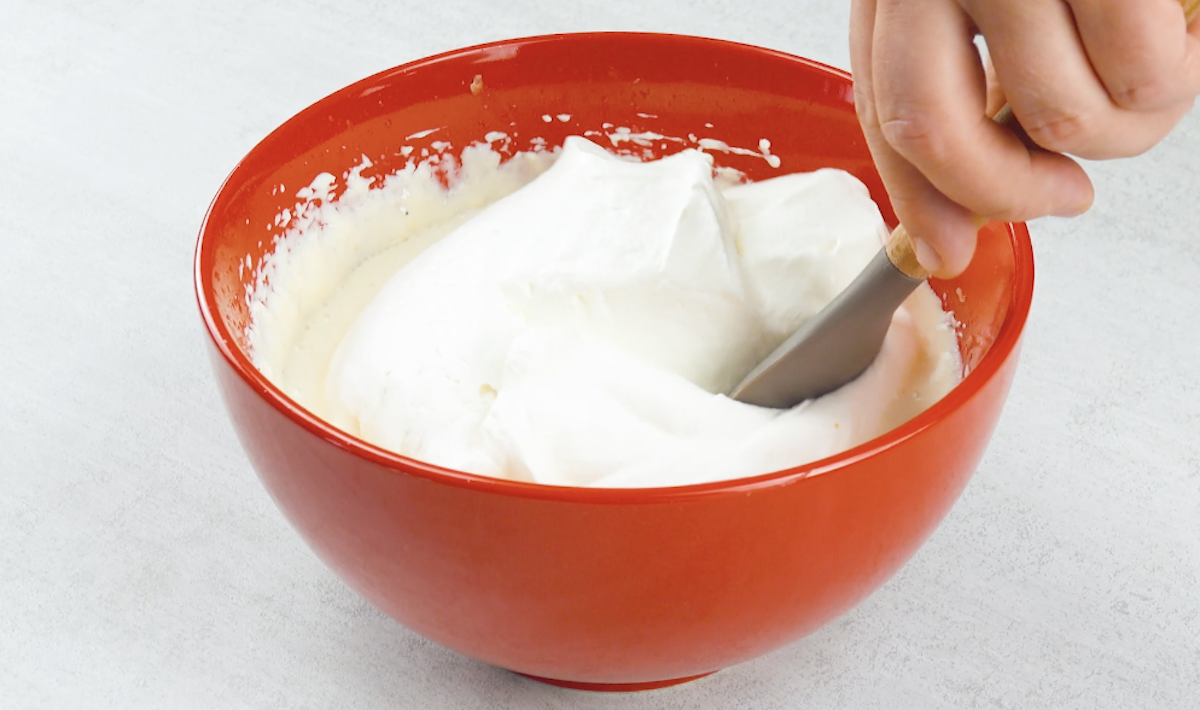 6. Calienta la gelatina remojada con un poco de la mezcla de queso crema en el microondas y revuelve todo hasta que esté suave. Agrega esta mezcla al resto de la crema de queso crema. Bate la crema (nata) ligeramente y agrégala a la mezcla anterior. Añade el extracto de vainilla y el jugo de limón. Viértelo todo en una manga pastelera.