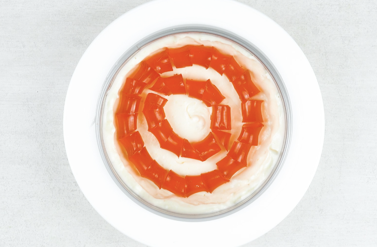8. Saca del refrigerador el molde con la base de galletas y aplícale una fina capa de crema de queso crema. Luego coloca los tubitos de gelatina roja en dos círculos sobre la crema (ver foto). En el espacio entre los dos círculos rojos, echa más crema, sobre todo en el borde superior de la gelatina roja.