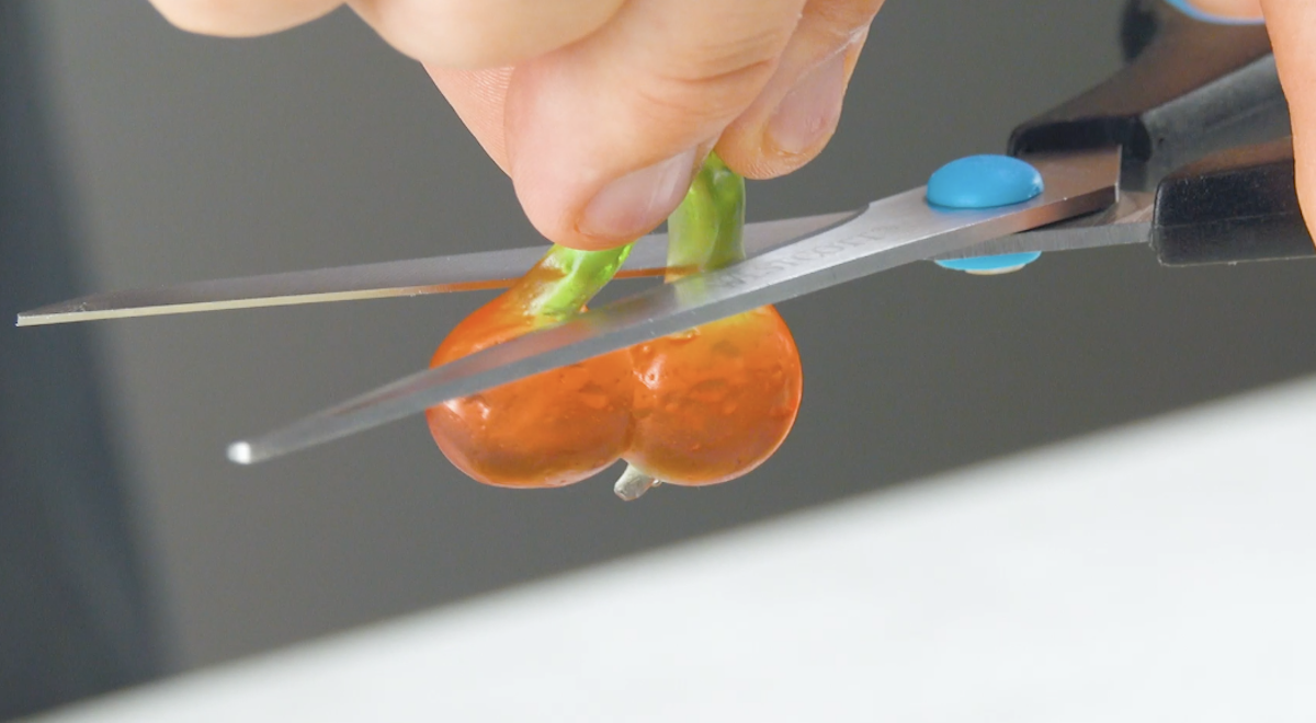 1. Con las tijeras, corta las gomitas en forma de cereza, de manera que puedas separar las partes verdes (100 g) en un cuenco y las partes rojas (200 g) en otro cuenco.