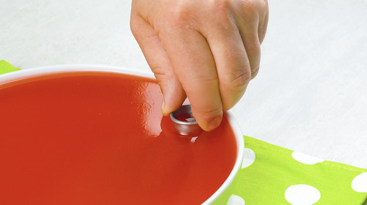 7. Con un pequeño cortador de galletas, corta tubitos de gelatina roja. Pon la gelatina sobrante de nuevo en una olla y derrítela, la necesitarás más tarde para la tapa del pastel.