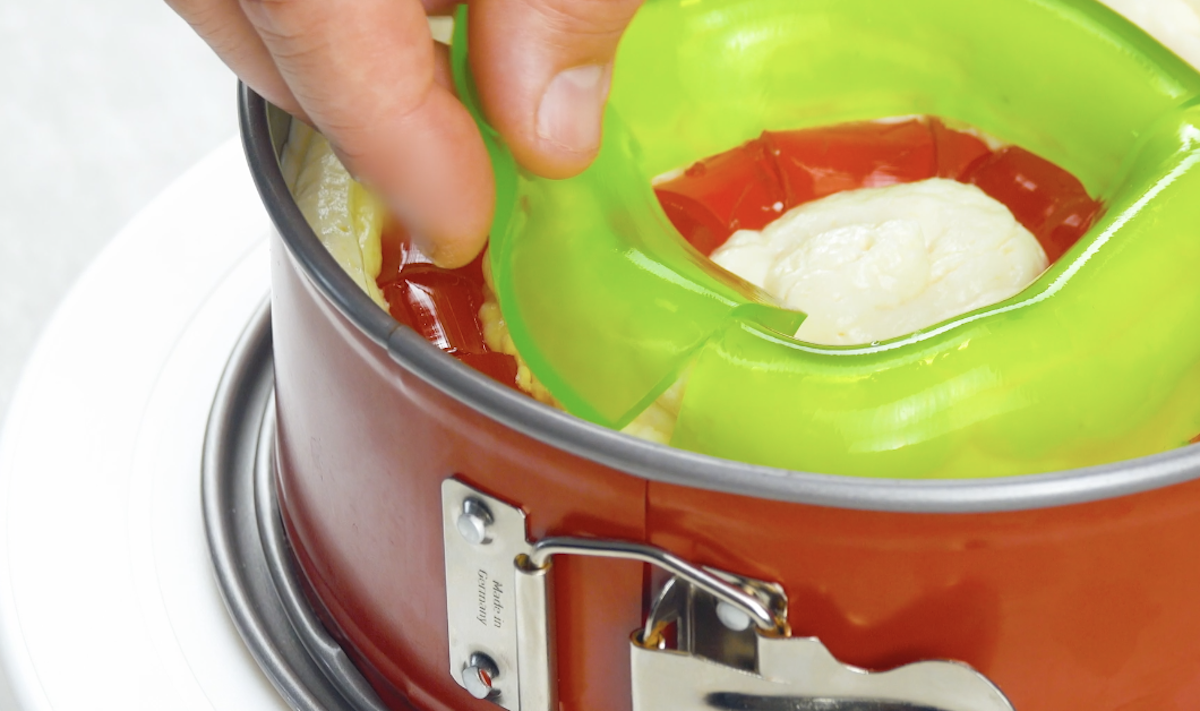10. Rellena con cuidado el molde con la mezcla de queso crema restante y alisa la superficie. Pon todo en el refrigerador durante unos 45 minutos. Cuando la mezcla de queso crema esté suficientemente firme, puedes verter la gelatina roja líquida (del punto 7) en la superficie. Luego coloca el pastel en el el refrigerador durante toda la noche.