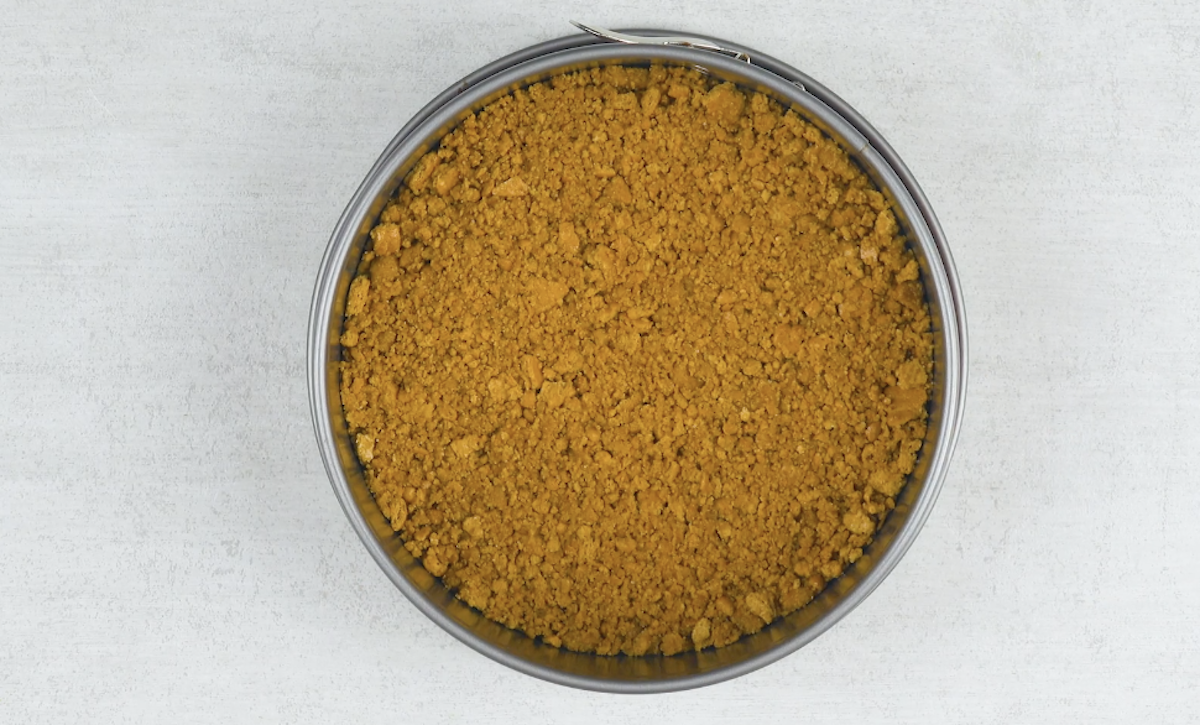 4. Desmiga las galletas integrales y mézclalas con mantequilla líquida y azúcar para formar una masa. Pon la masa en un molde para pasteles y presiónala firmemente hacia el fondo. Mete la base del pastel al refrigerador al menos una hora.