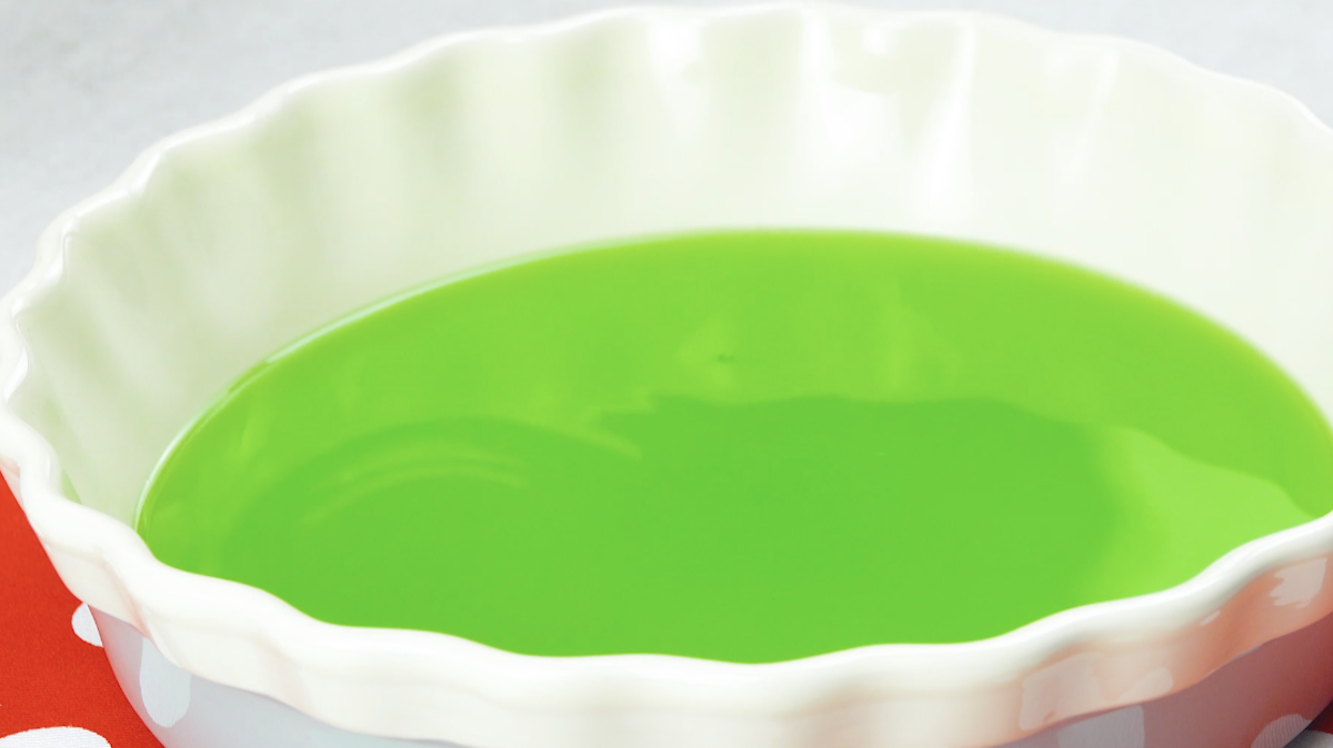 3. Para la gelatina verde hay que hacer lo mismo, pero sin el azúcar. Vierte la gelatina verde en un recipiente redondo y mételo en el refrigerador al menos 2 horas.