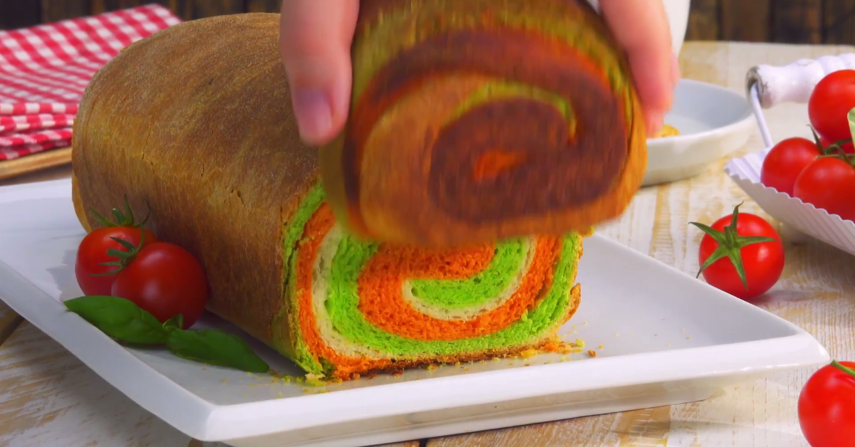 A primera vista parece una barra de pan como cualquier otra… ¡hasta que cortas la primera rebanada y descubres una explosión de colores en su interior! Parece una pieza de fantasía para alguna película con comida mágica, duendes y hadas. Ahora puedes llevar este arcoíris de sabor hasta tu mesa con esta sencilla receta. Prepárate para dejarte llevar por un remolino de tomate y espinaca…
