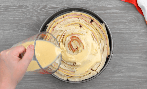 • Para la salsa royal, mezcla el huevo con la leche y salpimenta. Vierte la mezcla sobre el pan con queso y jamón del molde. Deja que el líquido empape y hornea a 160 °C durante 45 minutos con la circulación de aire activada.