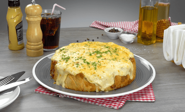 Sándwich XXL de queso y jamón hecho en molde para pastel