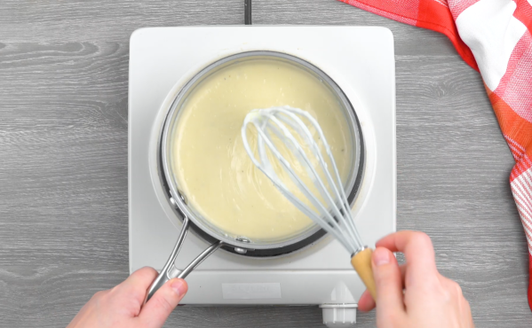 • Derrite mantequilla en una olla y añade harina. Hierve todo a fuego bajo removiendo constantemente, y añade leche. Deja todo hervir. Sazona con sal, pimienta y nuez moscada. Añade queso rallado y remueve con fuerza todo.