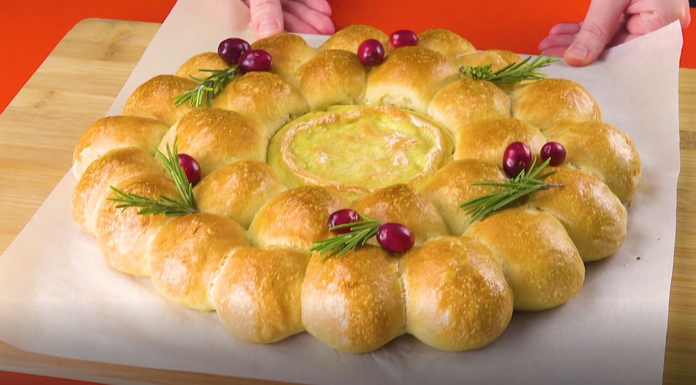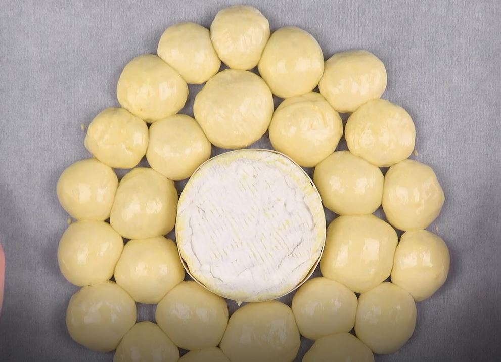 1.) Coloca el queso camembert en medio de un papel para hornear sobre una bandeja de horno. Luego, haz bolitas con la masa de pizza (26 idealmente) y ubícalas en dos círculos alrededor del queso. Pincela las bolitas de pizza con el huevo batido.