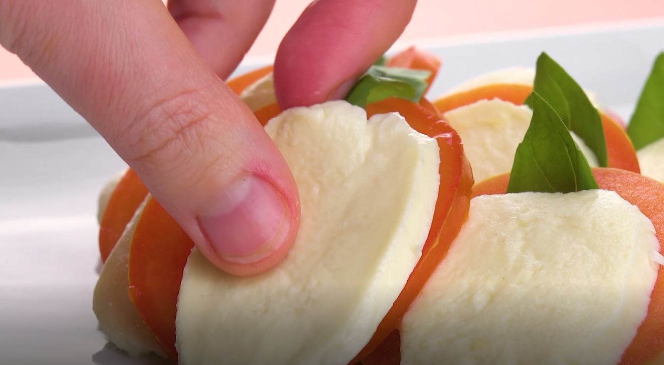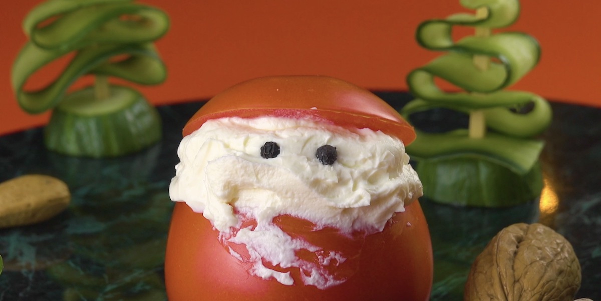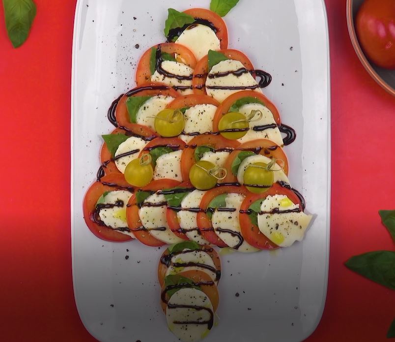 1.) Corta el tomate en rodajas y pon una de ellas en un extremo superior del plato. Luego, corta el queso mozzarella también en rodajas y haz con él y los tomates sobre el plato una forma piramidal. En la parte inferior, haz la forma del tronco para que parezca un arbolito de Navidad.