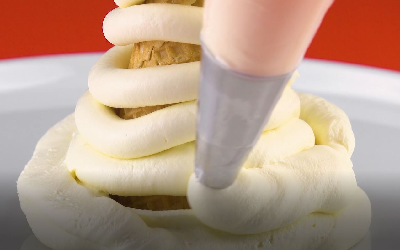 1.) Con una manga pastelera, pon queso crema sobre un plato en forma de «base» para sujetar el cono de helado. Luego, cubre el cono de helado con dos capas de queso crema.