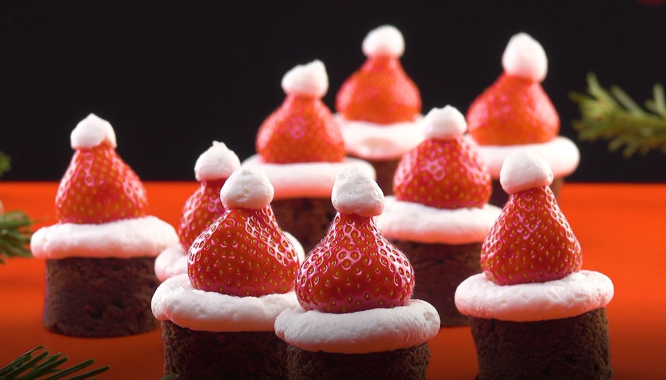 Con una manga pastelera, pon crema batida en la parte superior de los muffins o browies. Luego, encima de cada uno de ellos, coloca una frutilla. Para finalizar, haz un circulito de crema encima de cada frutilla, para que parezca el pompón del gorrito.