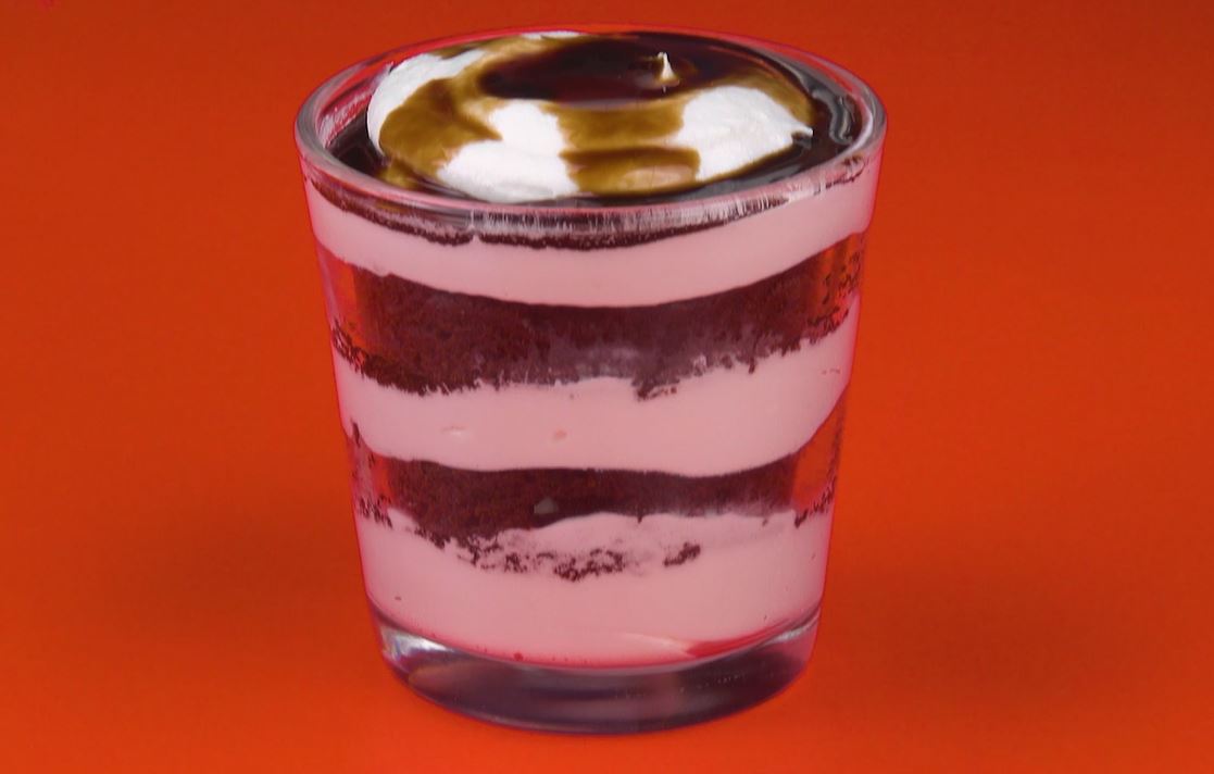1.) Primero, coloca los círculos de brownie y la crema batida de manera alternada hasta llenar el vaso. Al final, deberían quedar tres capas de crema y dos de brownies. Encima de todo eso, pon un poco de salsa de chocolate. Repite este proceso en los cuatro vasos.