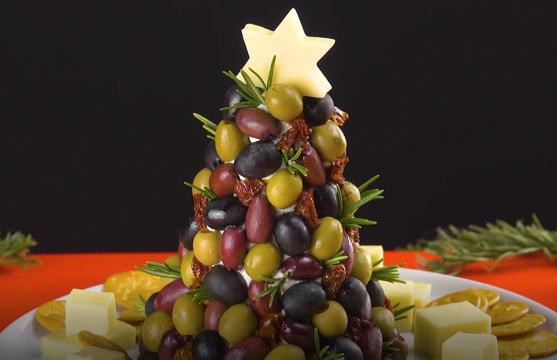 2.) Decora el cono pegando las aceitunas y los trozos de tomate seco al queso crema. Luego, inserta las ramitas de romero en algunos sectores para darle un toque verde y un exquisito aroma. Adorna alrededor del árbol con dados de queso como si fuesen regalos y galletas saladas. Por último, corta un trozo de queso en forma de estrella y ponlo en la punta del árbol. ¡Hermoso!