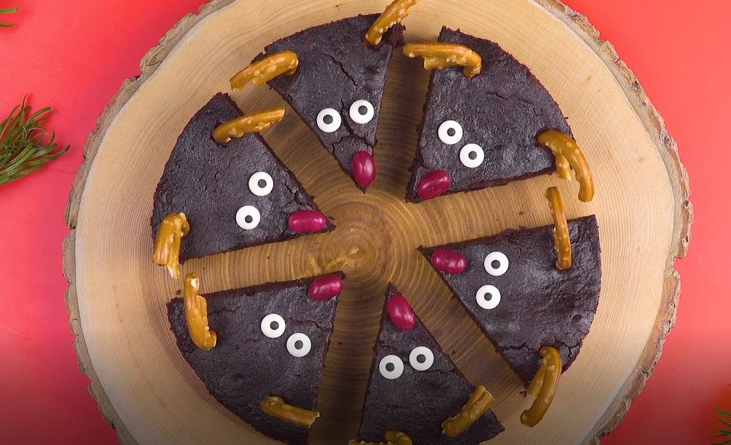 2.) Troza las rosquitas saladas o pretzels y pega dos en cada uno de los bordes grandes del pastel. Luego, pon un poco de cobertura también en los ojos de azúcar y ubícalos al medio, un poco más arriba que la «nariz». ¡Nunca viste un reno tan sabroso!