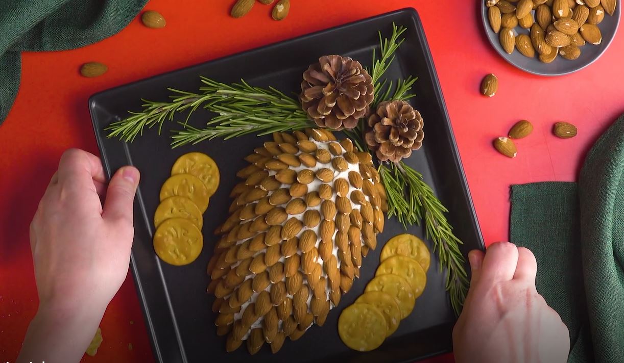 Sobre un plato, dale al queso crema una forma oval o de cono. Luego, entierra las almendras en fila, una al lado de la otra. Ahora coloca el romero en la parte superior del óvalo de queso para simular las «ramitas» de la piña.