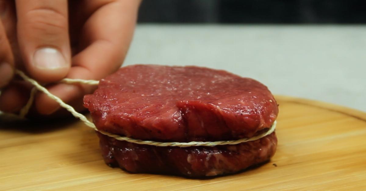 - Enrolla los dos solomillos con un hilo de cocina. Así, los solomillos seguirán jugosos después de pasarlos por la sartén y quedarán mejor en el hojaldre.