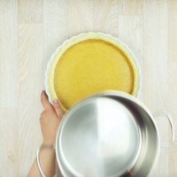 - Engrasa un molde de horno redondo con un poco de mantequilla. Presiona la masa bien sobre el fondo y los bordes y corta cualquier trozo sobrante.Corta un trozo de papel de hornear que coincida con la forma de la masa y colócalo encima de esta. A continuación, coloca una olla encima del papel de hornear. Deja en el horno 15 minutos a 180ºC. En cuanto la masa se haya enfriado, retira el papel de hornear y la olla.